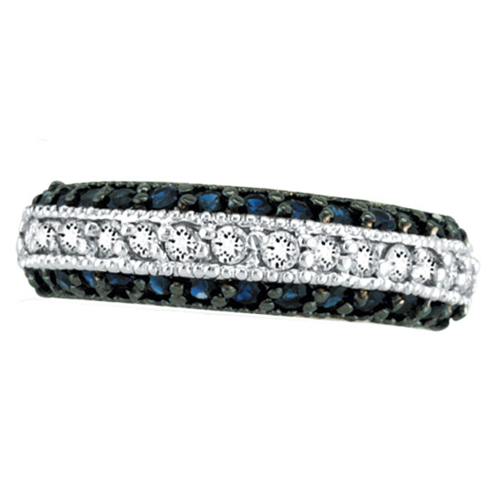 Sapphire & Diamond Fashion Ring in 14K white gold. Stones are set in a sparkling prong setting. One row of 14 diamonds run across the front of this ring, and are joined by 26 blue sapphires - one row on top, and another on the bottom. Black rhodium around the sapphires for a designer's touch.