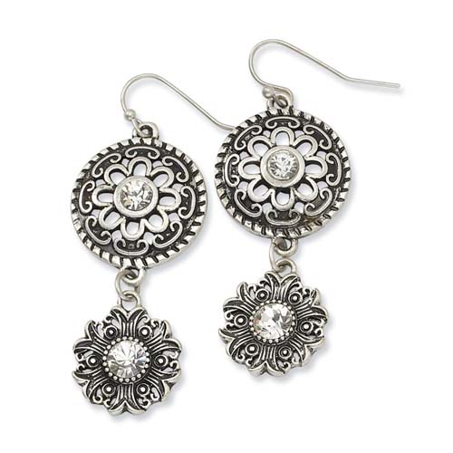 Silver-tone Double Drop Floral With Clear Crystal Dangle Earrings