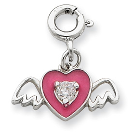 Sterling Silver Pink Enameled CZ Heart With Wings Charm