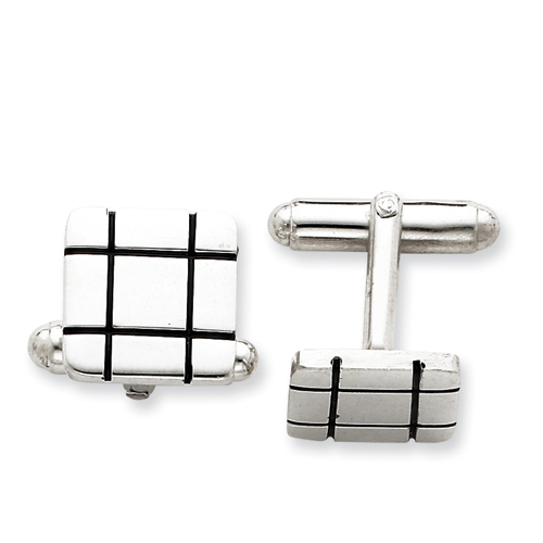 Sterling Silver and Black Enamel Grooved Design Square Cuff Links