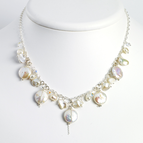 Sterling Silver Biwa/White Cult Pearl& Aurora Borealis Crystal Necklace chain