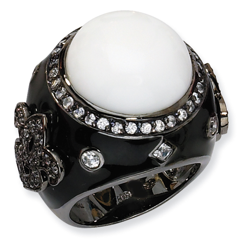 Black-plated Sterling Silver Enamel Simulated White Agate & CZ Ring