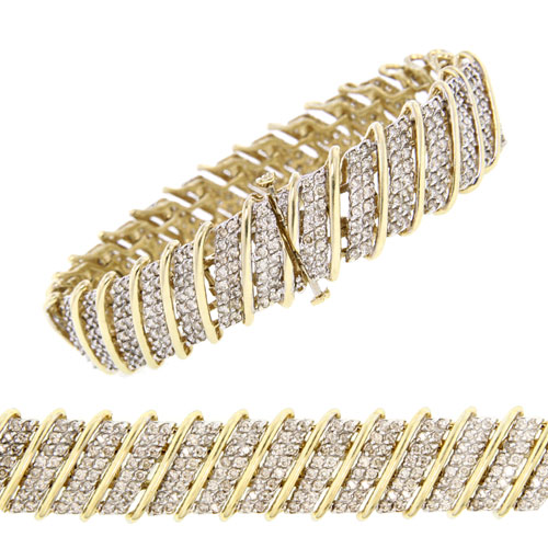 You're sure to shine in this beautiful diamond bracelet. The back is open and the clasp is double hinged for a secure and comfortable fit. 461 brilliant diamonds are set two diagonal rows at a time and separated by shiny, Yellow Gold bars. This gorgeous bracelet will add glamour to any outfit.