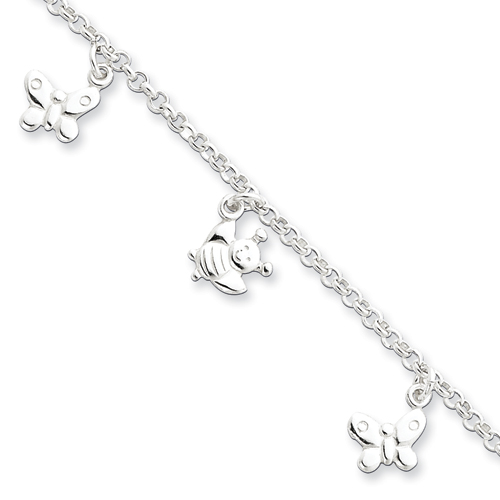 Sterling Silver Polished Butterflies & Bumble Bee Anklet