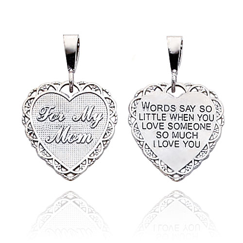 Show your Mom how much she means to you with this beautiful, meaningful pendant. 14K White Gold is used to craft this satin heart charm that features a scalloped edging. The front of the pendant features the words "For My Mom" and the back reads, "Words say so little when you love someone so much I love you." The charm is polished for maximum shine and hangs from a smooth gold bail.