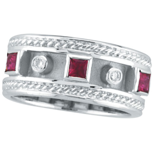 From our Byzantine Collection. Antique Style Ruby &The antique design goes all the way around except for a small shank in the back for sizing. Diamond Ring in 14K white gold. 3 princess cut rubies in the front set in a bezel setting. Big rubies measuring 3mm in size. 2 round, brilliant diamonds in between them.